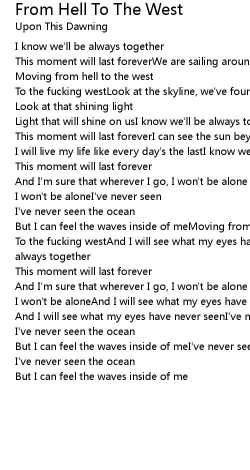 To the fucking westAnd I will see what my eyes have never seenI know we'll be always together |