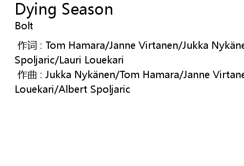 | [00:00.00-1] | 作词 : Tom Hamara/Janne Virtanen/Jukka Nykänen/Albert Spoljaric/Lauri Louekari |