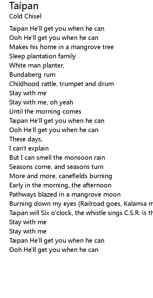 Burning down my eyes (Railroad goes, Kalamia mill If the heat don't get you, Taipan will Six o'clock, the whistle sings C.S.R. is the sugar-cane king) |