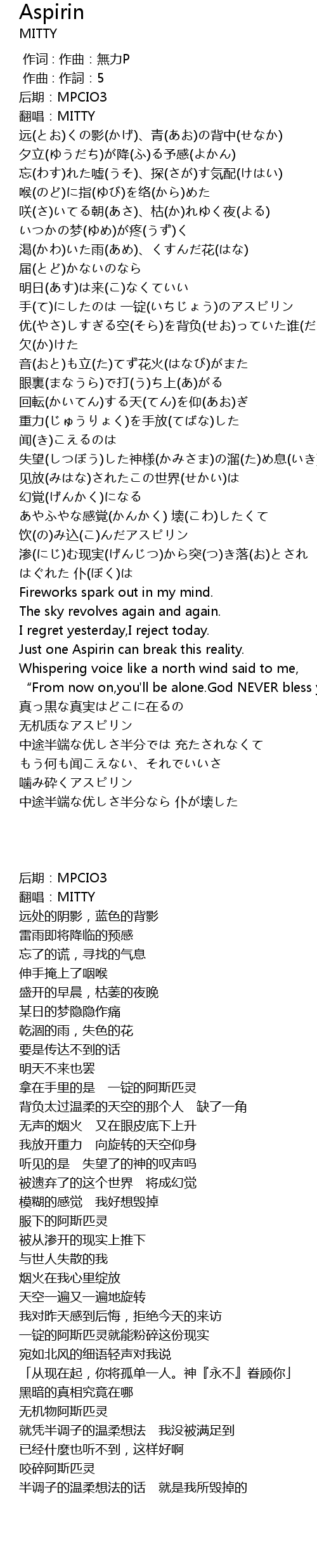 | [01:41.464] | 饮(の)み込(こ)んだアスピリン |
