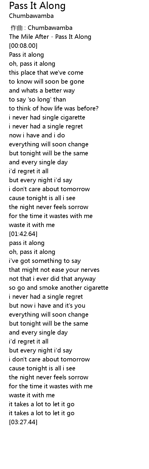 | [00:02.00] | The Mile After Pass It Along |