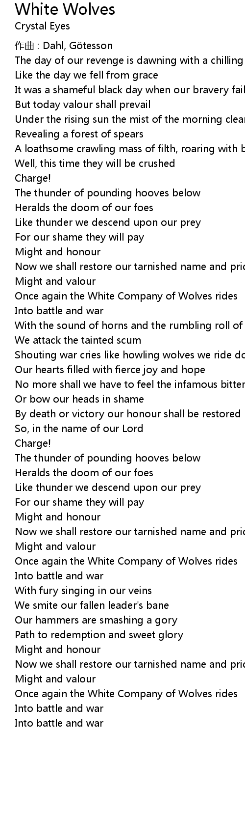 | Shouting war cries like howling wolves we ride down the slope | |