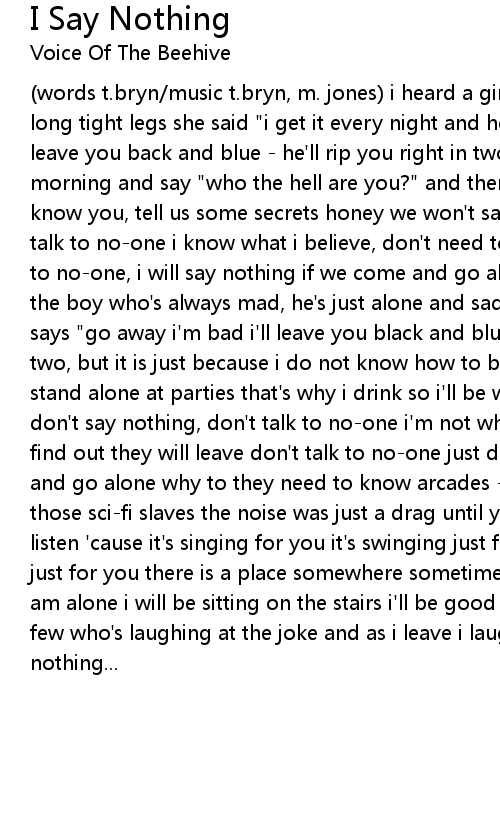 (words t.bryn/music t.bryn, m. jones) i heard a girl one day - she had these long tight legs she said "i get it every night and he calls me everyday" he'll leave you back and blue - he'll rip you right in two he'll wake up in the morning and say "who the hell are you?" and then she turned to me and said "we know you, tell us some secrets honey we won't say a word" but i say nothing, i talk to no-one i know what i believe, don't need to wear it on my sleeve i talk to no-one, i will say nothing if we come and go alone why do they need to know ? the boy who's always mad, he's just alone and sad he holds my hand so tightly he says "go away i'm bad i'll leave you black and blue and i'll rip you right in two, but it is just because i do not know how to be true. that's why i sometimes stand alone at parties that's why i drink so i'll be who they think i am" but don't say nothing, don't talk to no-one i'm not what they believe and if they find out they will leave don't talk to no-one just don't say nothing if we come and go alone why to they need to know arcades - all those endless days of all those sci-fi slaves the noise was just a drag until you said close your eyes and listen 'cause it's singing for you it's swinging just for you it's screaming just for you there is a place somewhere sometimes you'll find me there and if i am alone i will be sitting on the stairs i'll be good as new, one of a lonely few who's laughing at the joke and as i leave i laugh for you and i will say nothing... |