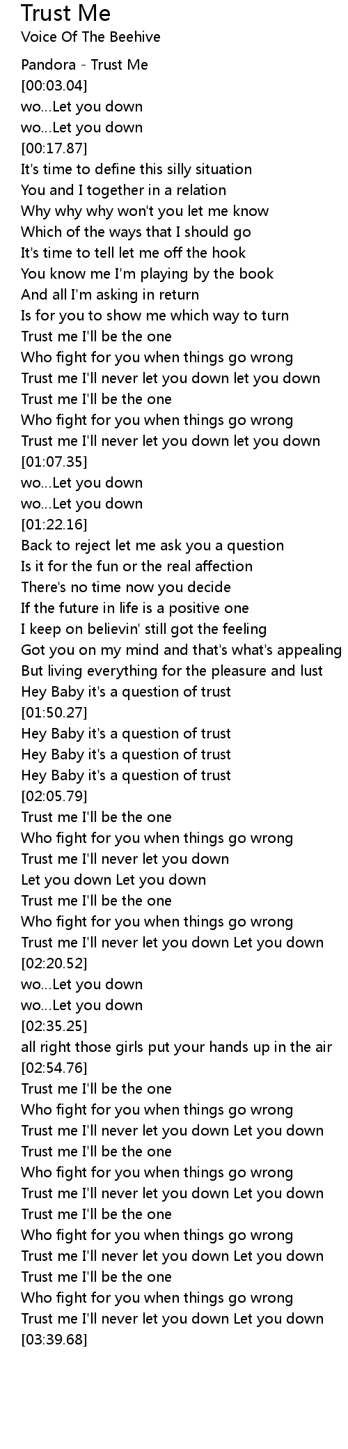 | [01:51.87] | Hey Baby it' s a question of trust |