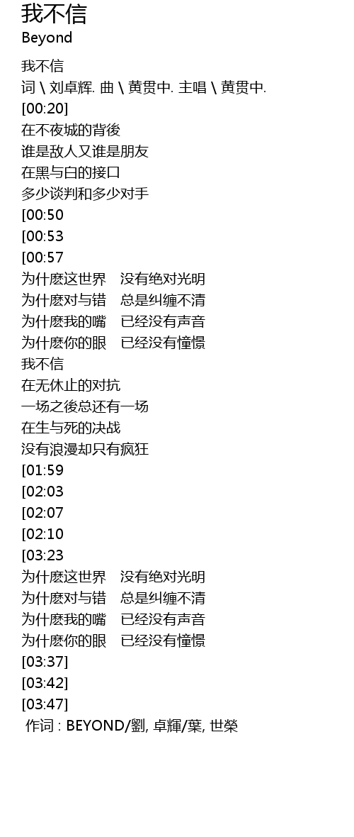 | [00:00.00] | 作词 : BEYOND/劉, 卓輝/葉, 世榮 |