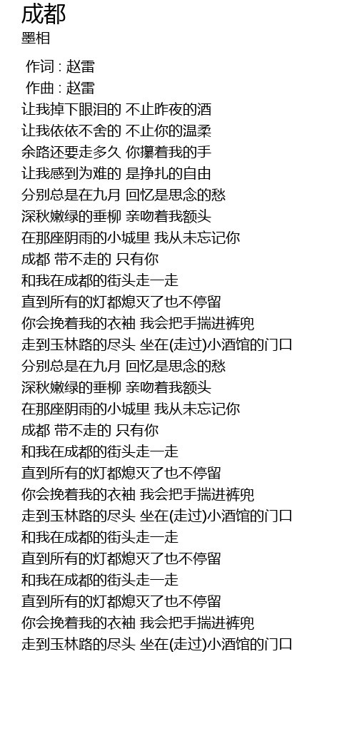 | [01:46.899] | 走到玉林路的尽头 坐在(走过)小酒馆的门口 |