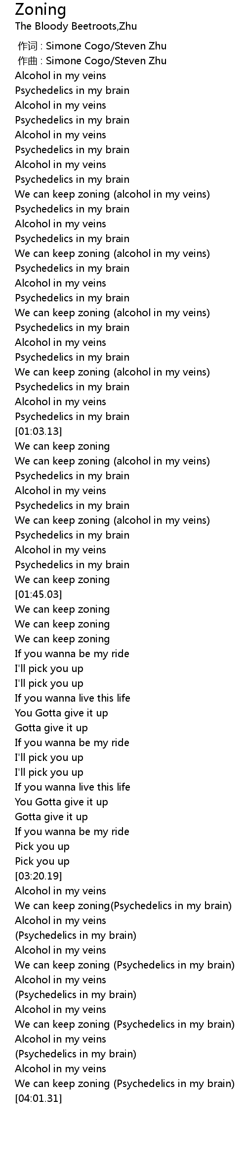 | [00:44.71] | We can keep zoning (alcohol in my veins) |