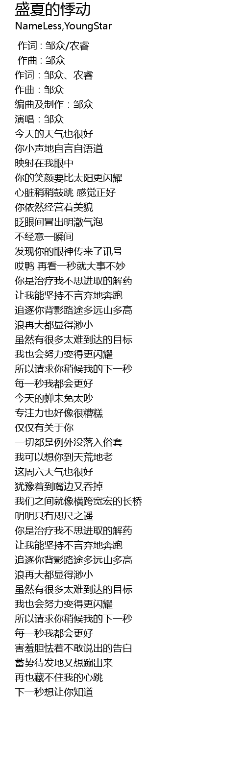 | [00:03.978] | 作词:邹众、农睿 |