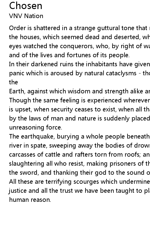 The earthquake, burying a whole people beneath the ruins of their houses; the river in spate, sweeping away the bodies of drowned peasants, together with the carcasses of cattle and rafters torn from roofs; and the victorious army slaughtering all who resist, making prisoners of the rest, looting by right of the sword, and thanking their god to the sound of cannon. |