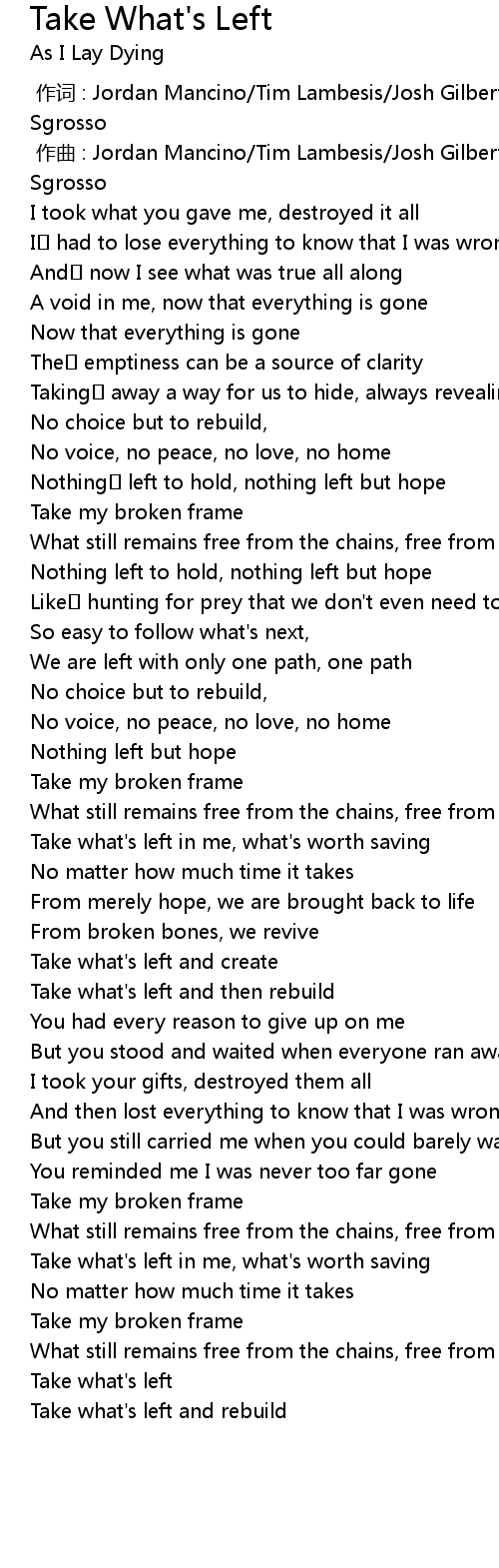 | [03:29.332] | Take what's left in me, what's worth saving |