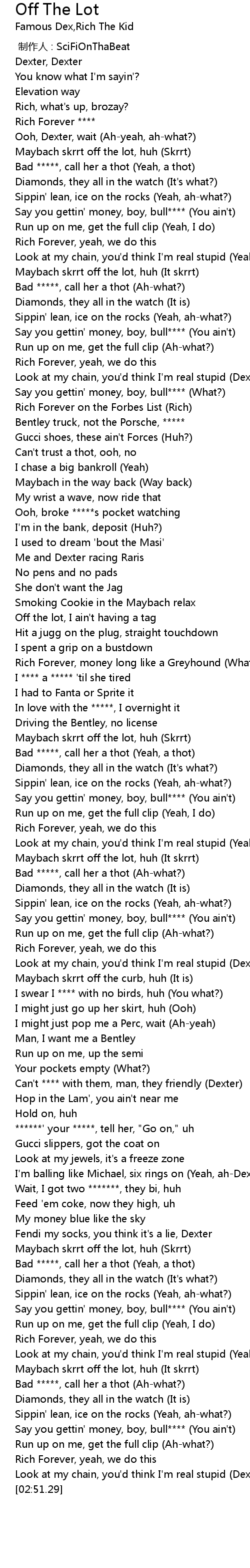 | [02:15.41] | Wait, I got two *******, they bi, huh |