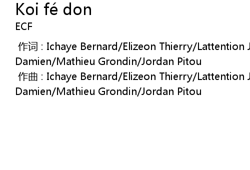 | [00:00.00-1] | zuo qu : Ichaye Bernard Elizeon Thierry Lattention Johan Baptiste Damien Mathieu Grondin Jordan Pitou |