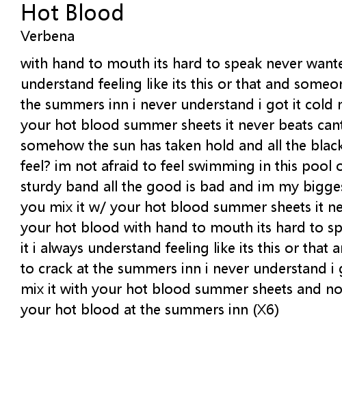 with hand to mouth its hard to speak never wanted ? did you ever ? i never understand feeling like its this or that and someone else is bound to crack at the summers inn i never understand i got it cold never old cant you mix it with your hot blood summer sheets it never beats cant you mix it with your hot blood somehow the sun has taken hold and all the black is turning gold does it ever feel? im not afraid to feel swimming in this pool of sand swear you found a sturdy band all the good is bad and im my biggest fan got it cold never old cant you mix it w/ your hot blood summer sheets it never beats cant you mix it with your hot blood with hand to mouth its hard to speak now you ? just keep wishing it i always understand feeling like its this or that and someone else is bound to crack at the summers inn i never understand i got it cold never old cant you mix it with your hot blood summer sheets and nothing beats cant you mix it with your hot blood at the summers inn (X6) |