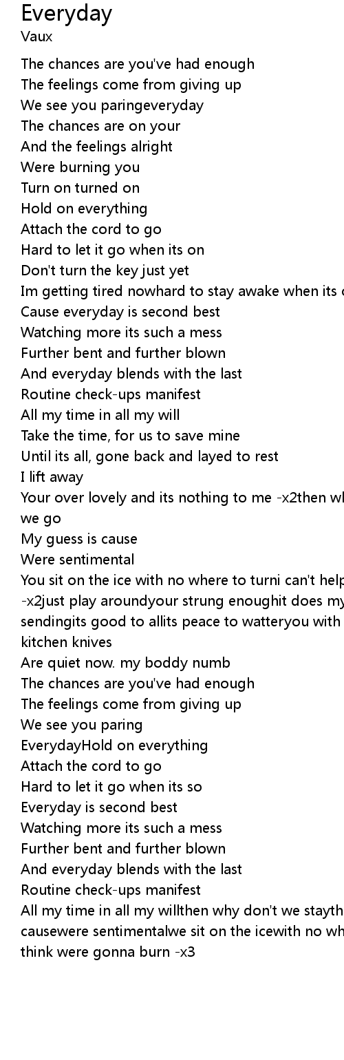 You sit on the ice with no where to turni can't help but think were gonna burn -x2just play aroundyour strung enoughit does my jobyou kiss my lipsthis sendingits good to allits peace to watteryou with the sharkclose the doorthe kitchen knives |