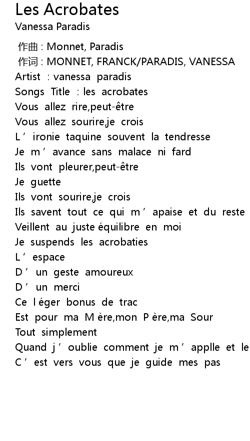 | [00:01.00] | 作词 : MONNET, FRANCK/PARADIS, VANESSA |