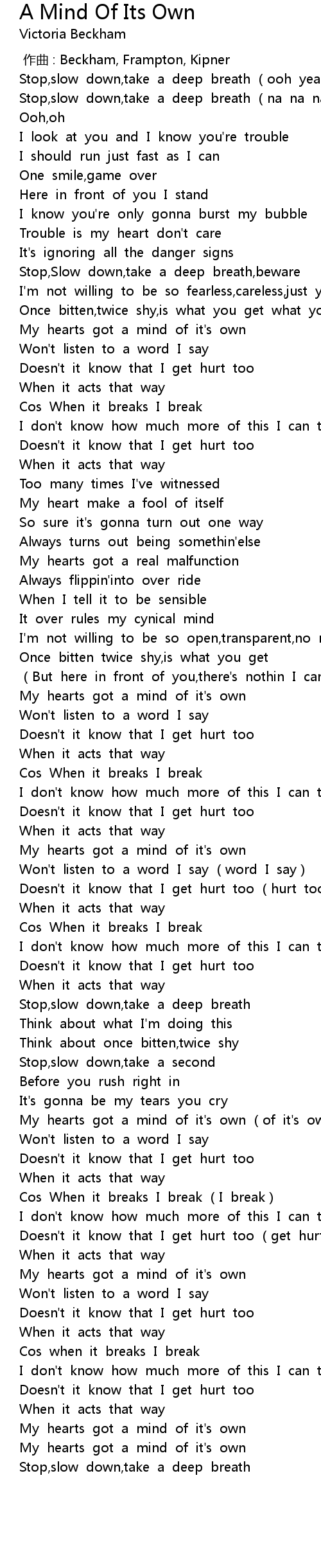 | [02:40.07] | My hearts got a mind of it' s own of it' s own |