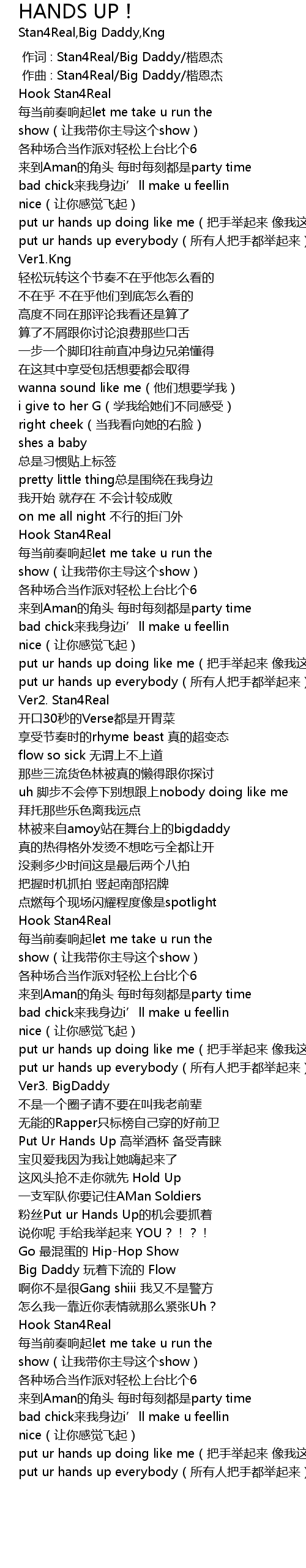 | [01:58.210] | put ur hands up everybody suǒ yǒu rén bǎ shǒu dōu jǔ qǐ lái |