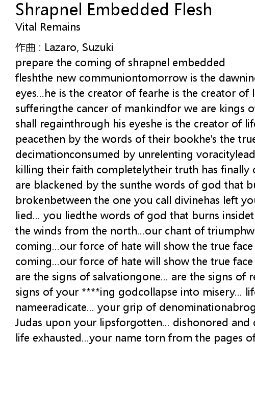 | Music Lazaro Lyrics Suzuki prepare the coming of shrapnel embedded fleshthe new communiontomorrow is the dawning of the ageof ammunitionthrough my eyes... he is the creator of fearhe is the creator of lieshe is the creator of sufferingthe cancer of mankindfor we are kings of our domainthe rule supreme we shall regainthrough his eyeshe is the creator of lifehe is the creator of peacethen by the words of their bookhe' s the true creator of warcomplete decimationconsumed by unrelenting voracitylead them into the world of truthby killing their faith completelytheir truth has finally come undoneas their eyes are blackened by the sunthe words of god that burns insidethe trust is brokenbetween the one you call divinehas left you screaming... you lied... you lied... you liedthe words of god that burns insidethe trust is brokenlisten to the winds from the north... our chant of triumphwe are coming... we are coming... our force of hate will show the true face of godwe are coming... we are coming... our force of hate will show the true face of god repeat verses gone... are the signs of salvationgone... are the signs of revelationgone... are the signs of your ing godcollapse into misery... life exhaustedwretched be thy nameeradicate... your grip of denominationabrogation... the taste of | |