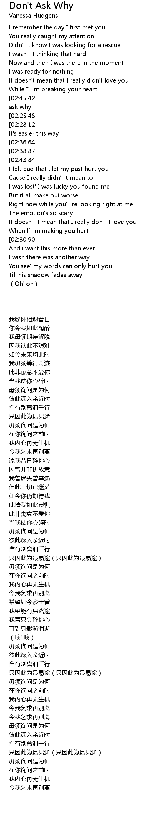 | [02:56.59][02:45.42][02:34.00][02:22.50][01:37.65][01:26.19][00:46.56][00:35.23] | Don' t ask why |