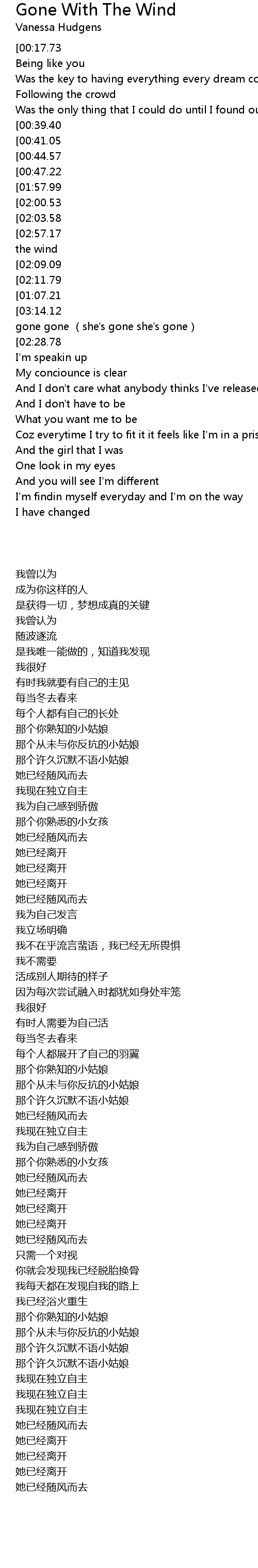 | [03:08.44][02:57.17][02:17.56][02:06.17][01:09.83][00:58.46] | Well she' s gone with the wind |
