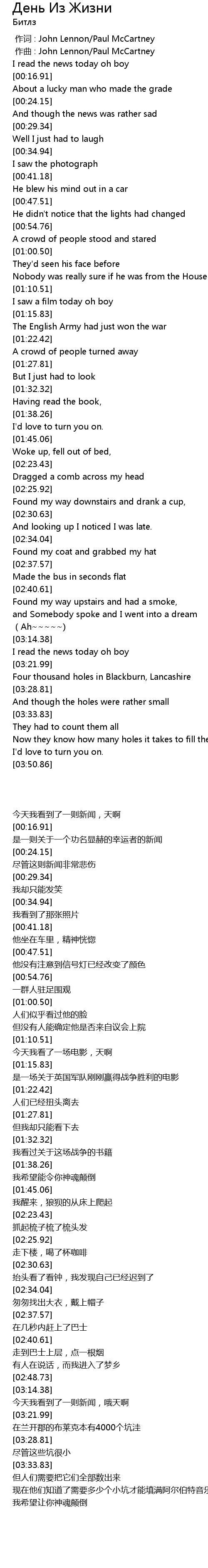| [00:12.76] | I read the news today oh boy |