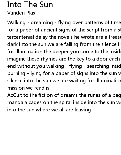 Walking - dreaming - flying over patterns of time searching - lying - burning for a paper of ancient signs of the script from a stranger had a long tercentenial delay the novels he wrote are a treasure a meander down from the dark into the sun we are falling from the silence into the sun we are waiting for illumination the deeper you come to the inside words built up a new universe imagine these rhymes are the key to a door each term is a pathway erased in the end without you walking - flying - searching inside of these lines dreaming - burning - lying for a paper of signs into the sun we are falling from the silence into the sun we are waiting for illumination a view to the source of the mission we read is |