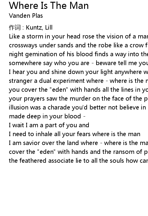 | I hear you and shine down your light anywhere where is the man kind of a stranger a dual experiment where where is the man under this " rosary cirus" you cover the " eden" with hands all the lines in your hand from the burdons of your prayers saw the murder on the face of the paperfront today his grand illusion was a charade you' d better not believe in him out of your salt was made deep in your blood | |
