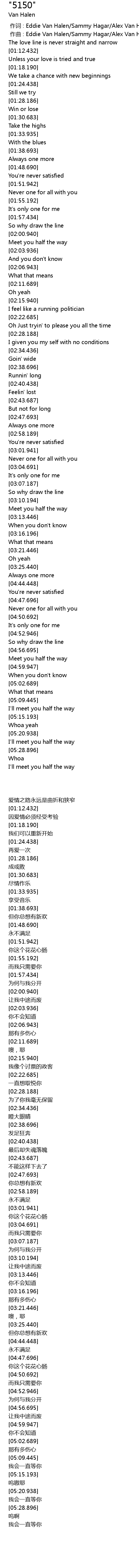 | [00:01.000] | zuo qu : Eddie Van Halen Sammy Hagar Alex Van Halen Michael Anthony |