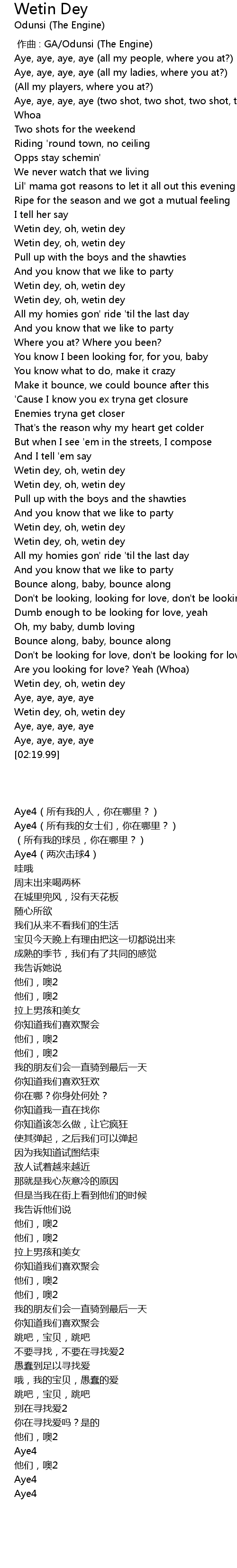 | [01:34.91] | Wetin dey, oh, wetin dey |
