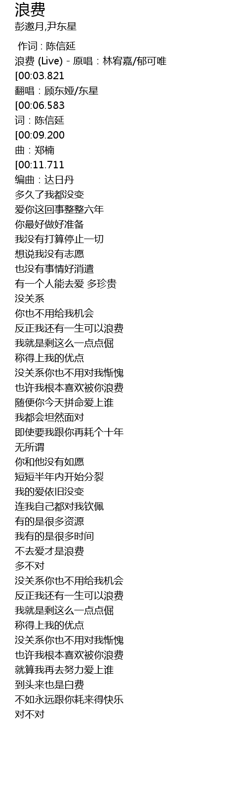 | [00:00.716] | 浪费 (Live) - 原唱:林宥嘉/郁可唯 |