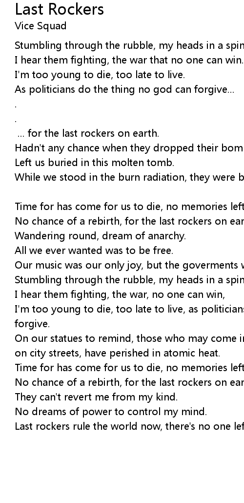 Last rockers rule the world now, there's no one left to fight now. |