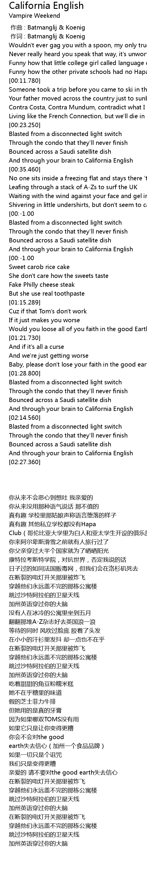 | [00:00.36] | zuò cí : Batmanglij Koenig |