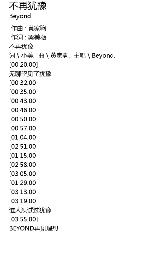 | [00:10.00] | 词 \ 小美. 曲 \ 黄家驹. 主唱 \ Beyond. |