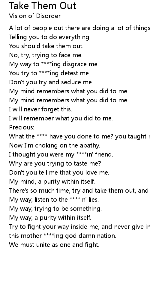 Try to fight your way inside me, and never give in to the ****in' suffocation of this mother ****ing god damn nation. |