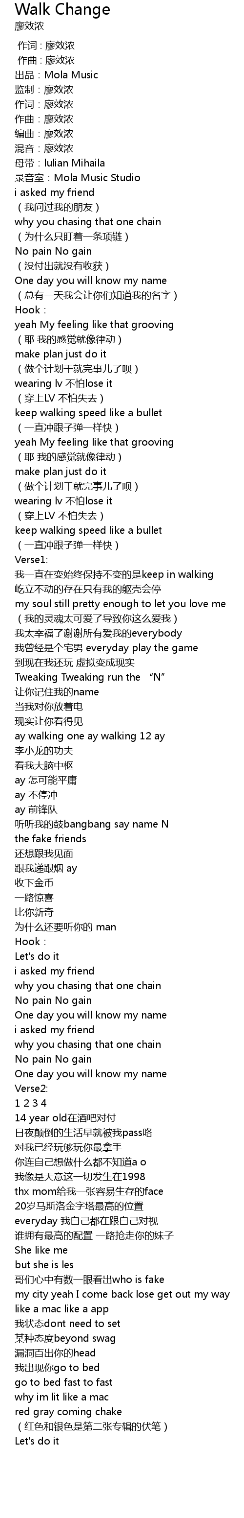 | [00:41.397] | wǒ yī zhí zài biàn shǐ zhōng bǎo chí bù biàn de shì keep in walking |
