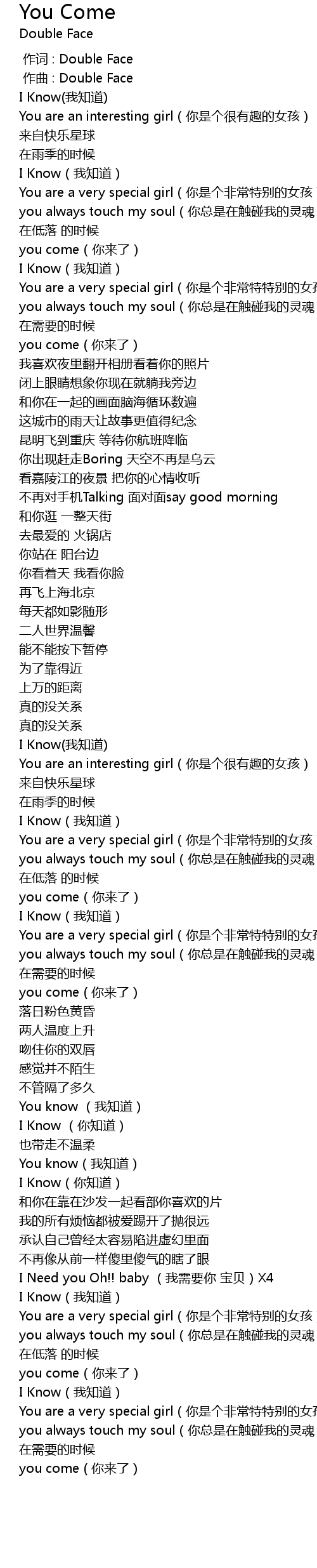 | [02:58.033] | You are a very special girl nǐ shì gè fēi cháng tè bié de nǚ hái |