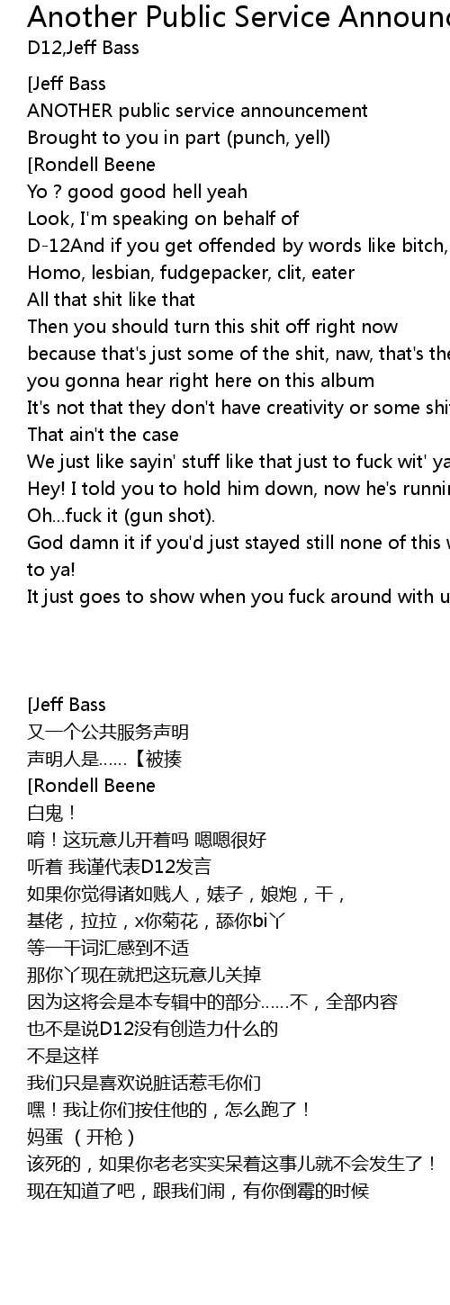 | [00:14.71] | D12And if you get offended by words like bitch, hoe, sissy, bangin, |