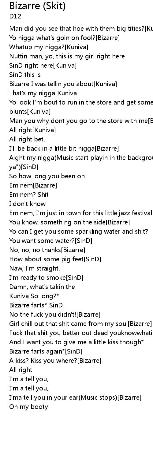 Aight my nigga(Music start playin in the background "Bizarre's gonna rape ya")[SinD] |