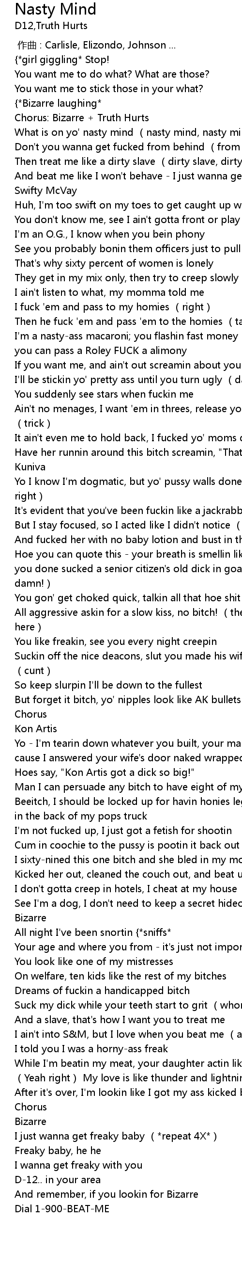 | [01:48.01] | Suckin off the nice deacons, slut you made his wife leave him (cunt) |