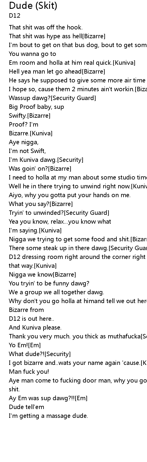 | Aye man come to fucking door man, why you got this nigga blockin' thewind and shit. | |