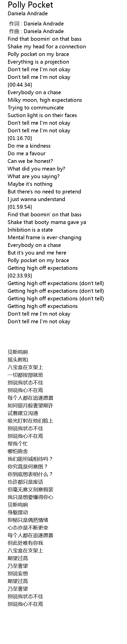 | [02:38.72] | Getting high off expectations (don't tell) |