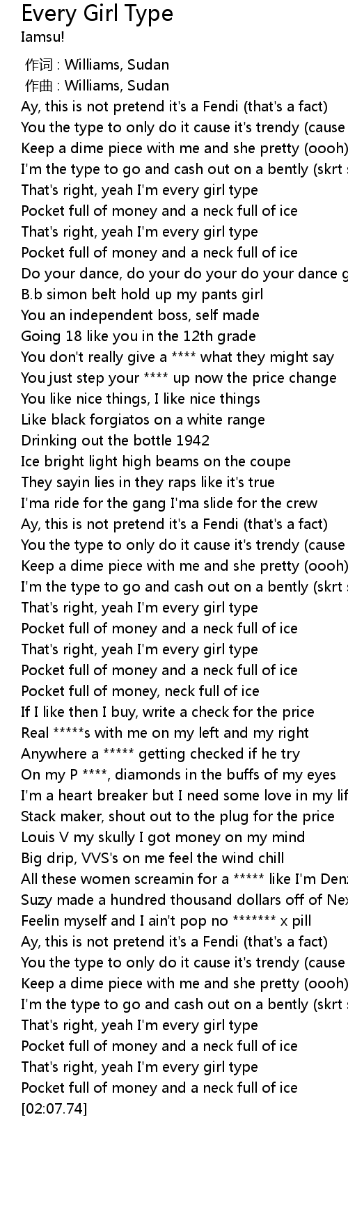 | [00:19.04] | That's right, yeah I'm every girl type |