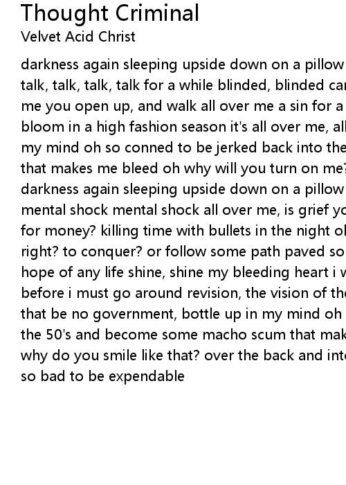 darkness again sleeping upside down on a pillow of nails push it, smile oh talk, talk, talk, talk, talk for a while blinded, blinded can't see a door in front of me you open up, and walk all over me a sin for a bottle of gin drunken flowers bloom in a high fashion season it's all over me, all over me, greed open up in my mind oh so conned to be jerked back into the 50's and become some macho scum that makes me bleed oh why will you turn on me? why do you smile like that? darkness again sleeping upside down on a pillow made of nails mental shock mental shock mental shock all over me, is grief you can't see what will you do for money? killing time with bullets in the night oh right, oh right what is right? to conquer? or follow some path paved some years ago? with no hope, no hope of any life shine, shine my bleeding heart i will dance one more time before i must go around revision, the vision of the cult of the ruling class that be no government, bottle up in my mind oh so conned to be jerked back into the 50's and become some macho scum that makes me free oh why do you betray me? why do you smile like that? over the back and into a system of oppression hurts so bad to be expendable |
