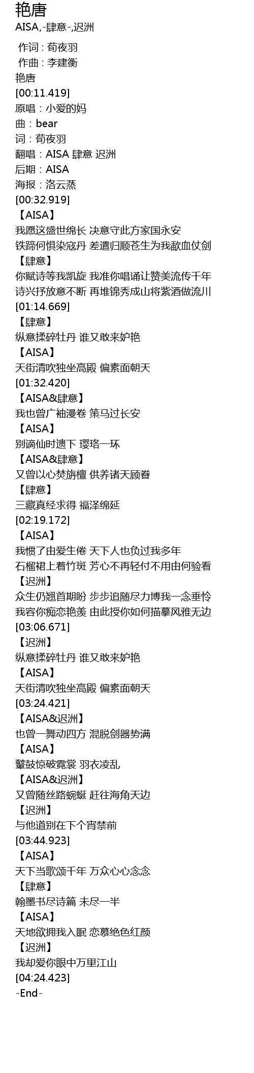 | [00:18.420] | 翻唱:AISA 肆意 迟洲 |