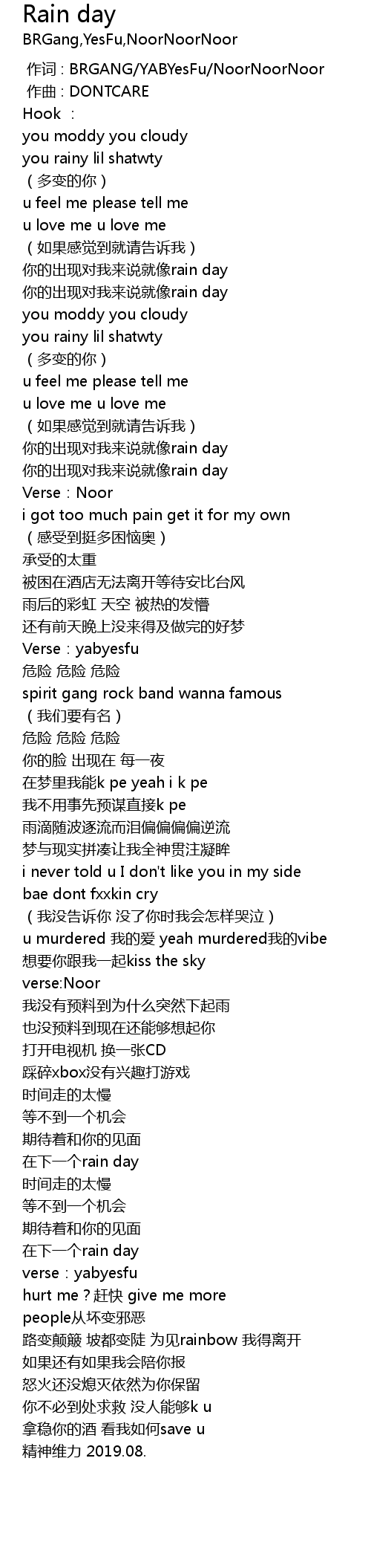 | [00:38.055] | 你的出现对我来说就像rain day |