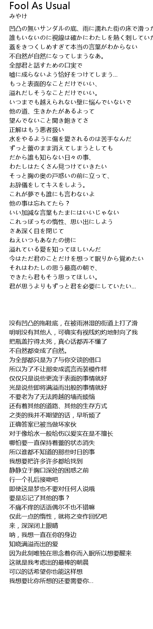 | [01:37.77] | 水をやるように傷を愛されるのは苦手なんだ |