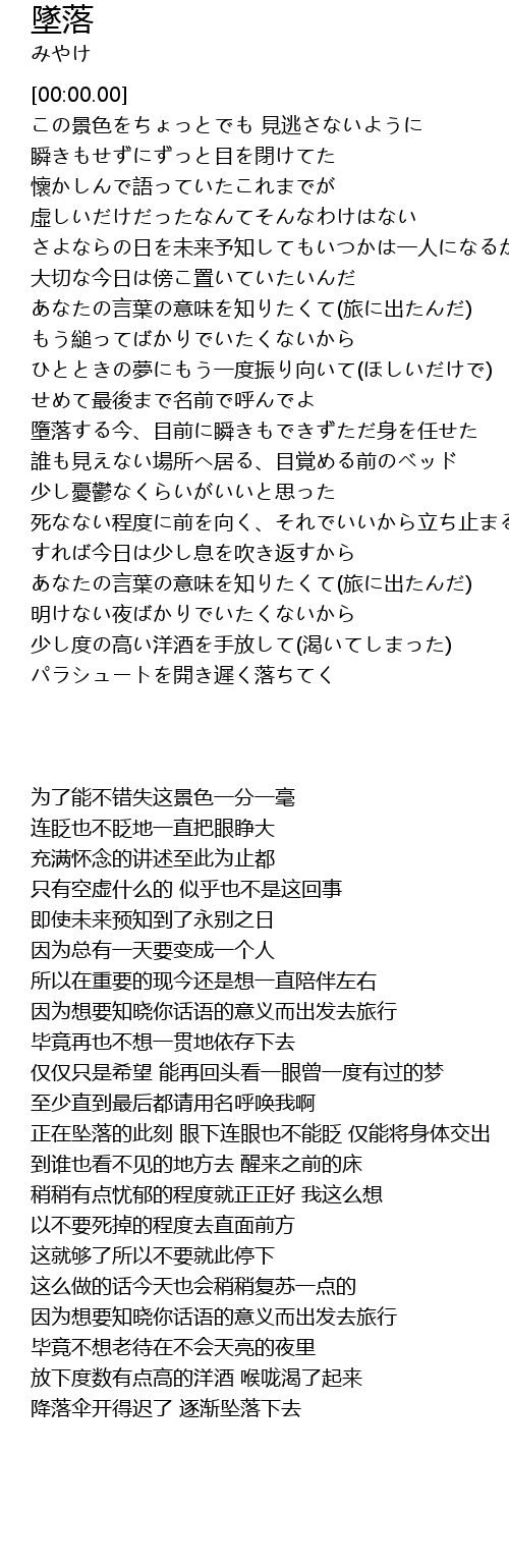 | [02:59.68] | パラシュートを開き遲く落ちてく |