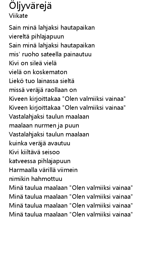 | Minä taulua maalaan "Olen valmiiksi vainaa" |