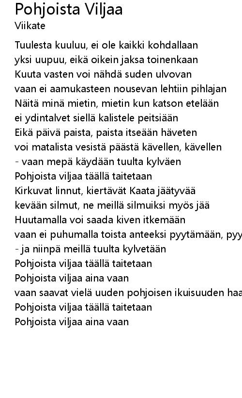 | Song | Pohjoista Viljaa |
