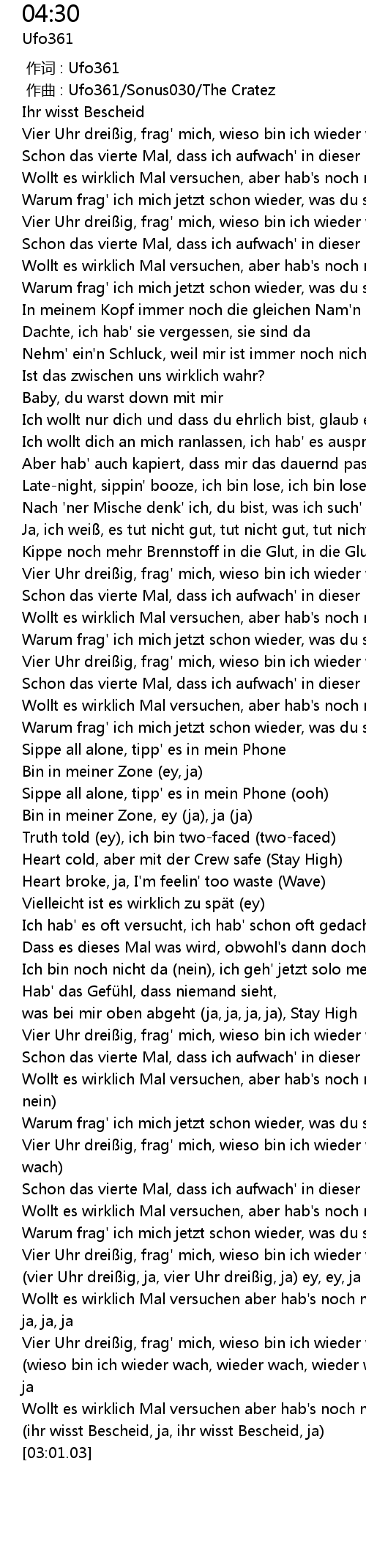 | [01:24.59] | Vier Uhr drei ig, frag' mich, wieso bin ich wieder wach? ja |
